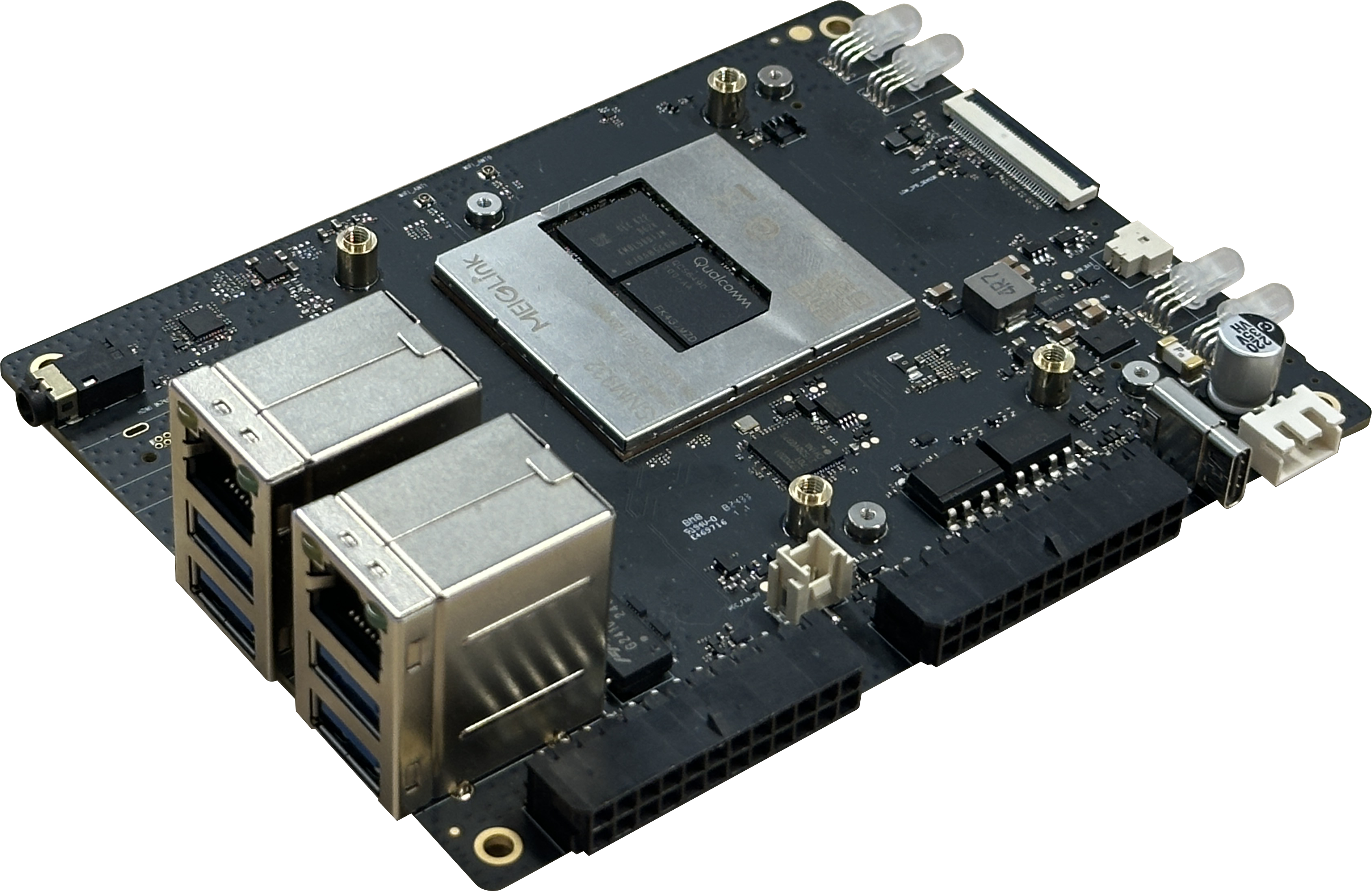 QG刮刮乐SNM932开发套件是一款基于高通QCS6490为平台的高算力开发套件,采用6nm制程,集成了Android 14/Ubuntu20.04系统。模组内置AI处理器 Dual HVX 和 4K HMX,AI 算力最高可达12Tops,封装上可兼容SNM950(QCS8250) & SNM960(SM8475) & SNM970(QCS8550)模组,拥有强大的图形处理能力和视频编解码能力,以及丰富的外围接口。